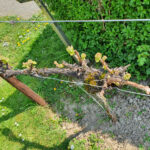 In den letzten Tagen hat das Lehrweinbergteam Hildegard und Götz Teichgreeber und Friedhelm Saffé das Binden der Reben abgeschlossen. Dabei wurde das Binden in der klassischen Form durchgeführt, wie es auch die angehängte Schautafel zeigt. Weitere Fotos zeigen die unterschiedliche Bindeweise für die einzelnen Rebsorten. Nicht gebunden wird der Spätburgunder, der über die Jahre spiralförmig um den Stützpfahl gewachsen ist.