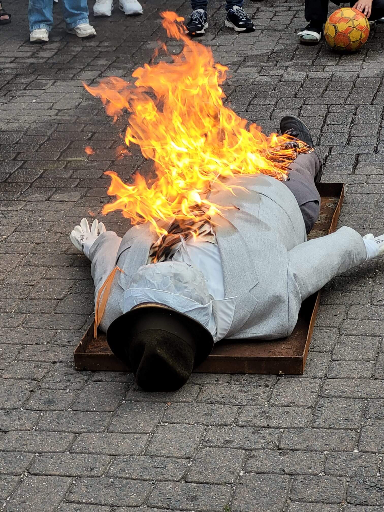 Zum Schluss wurde dem Kirmeskerl „Willy“, im rheinischen auch Paias genannt, mit einer Prozession durch den Ort die letzte Ehre erwiesen, musikalisch begleitet durch den Spielmannszug des TV Eiche. Hochwürden Thorsten Brodesser aus Selhof verabschiedete den Paias feierlich, bevor er brennend emporstieg und damit symbolisch das Ende der Kirmes markierte.