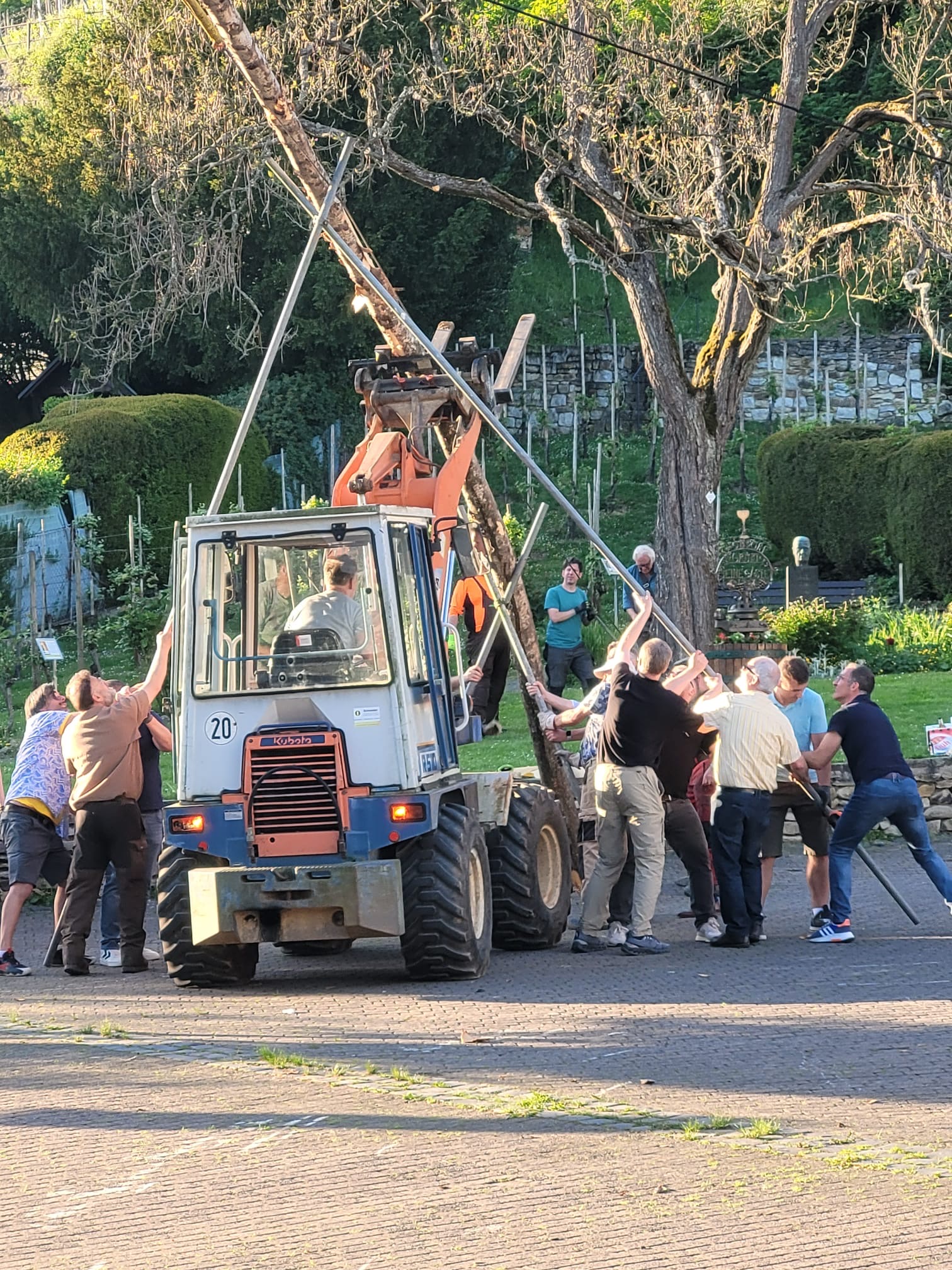 Beim ersten Versuch, unseren Maibaum sicher aufzustellen, herrschte gespannte Aufmerksamkeit. Trotz maschineller Unterstützung wollte das Vorhaben nicht gelingen. Als sich ein leises Knacken im Stamm vernehmen ließ, stockte vielen der Atem.